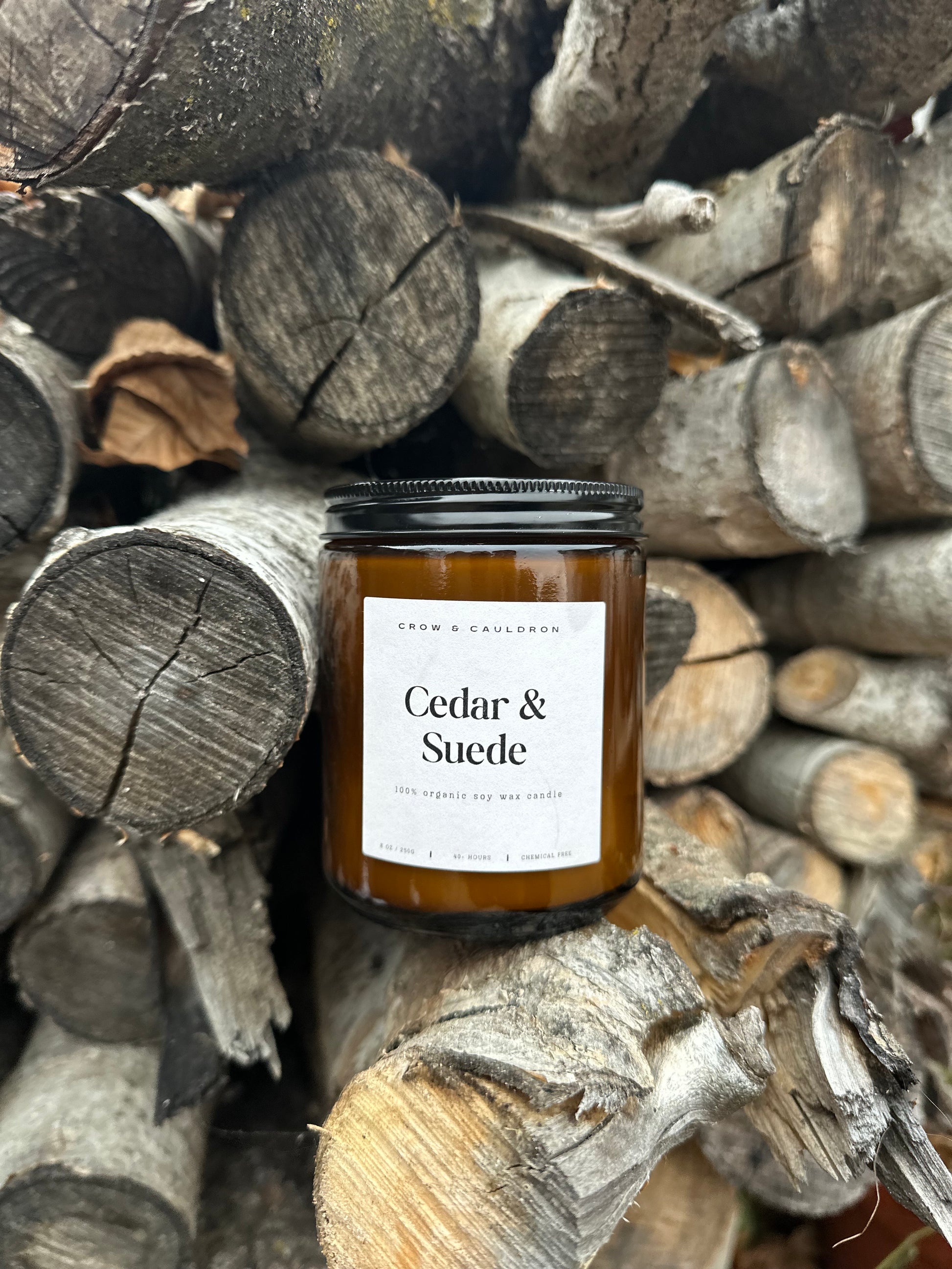 Cedar & Suede is warm, grounded, and quietly luxurious. Soft suede opens the scent with a smooth, worn-in richness, layered with gentle incense and subtle spice at the heart. The burn settles into earthy cedarwood, creating a cozy, masculine-leaning fragrance that feels like a leather chair by the fire, wrapped in calm and comfort.